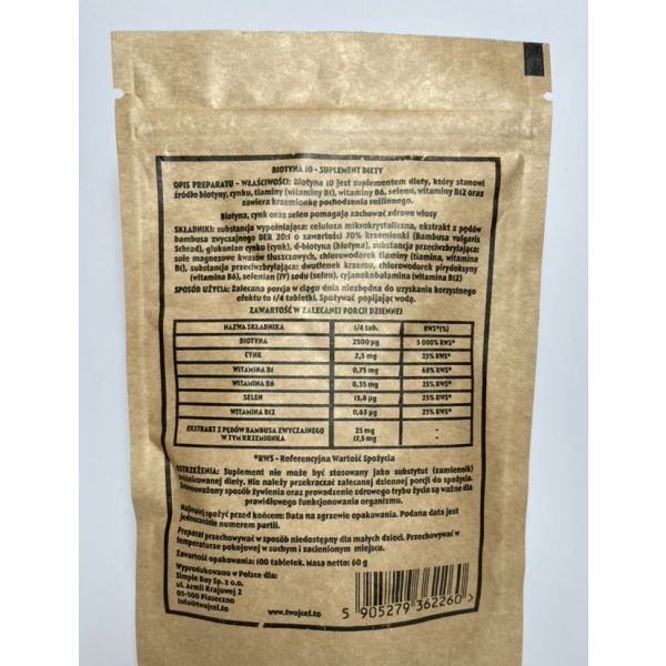 SKŁAD: substancja wypełniająca: celuloza mikrokrystaliczna, ekstrakt z pędów bambusa zwyczajnego DER 20:1 o zawartości 70% krzemionki (Bambusa vulgaris Schrad), glukonian cynku (cynk), d-biotyna (biotyna), substancja przeciwzbrylająca: sole magnezowe kwasów tłuszczowych, chlorowodorek tiaminy (tiamina, witamina B1), substancja przeciwzbrylająca: dwutlenek krzemu, chlorowodorek pirydoksyny (witamina B6), selenian (IV) sodu (selen), cyjanokobalamina (witamina B12).